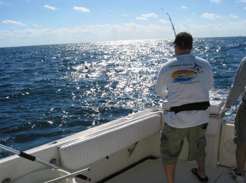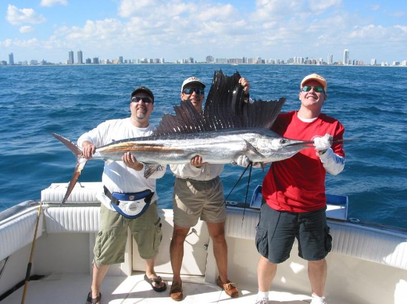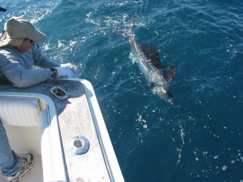 sinker.The deep rod sings out and it's Alex's shot at a Miami sail....on a 20lb test spinner. The fish performed some tailwalking acrobatics and from our first glimpse it